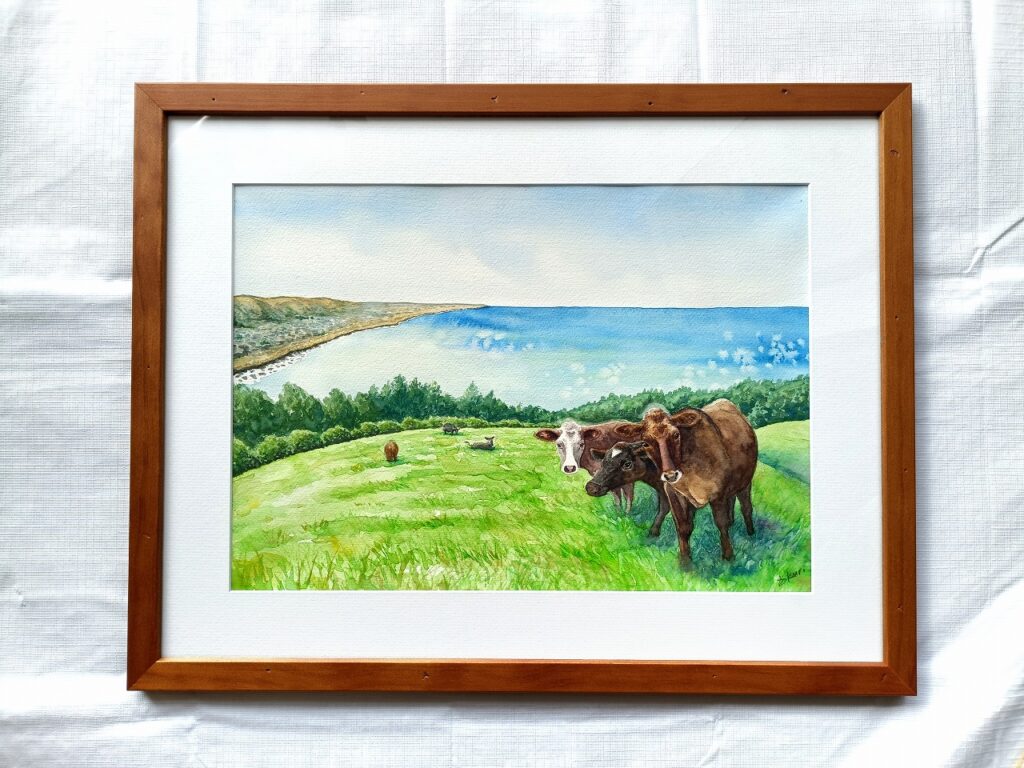 水彩画「丘の上の牛」Watercolour painting: Cows on the hill above the ocean