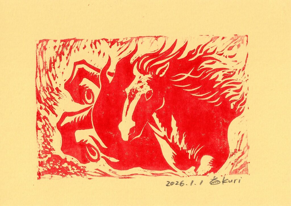 明けましておめでとうございます!午年は活動的でエネルギッシュな年になるそうなので、力強く駆ける馬を版画で表現しました。2026年、皆さん健康で元気に駆け抜けましょう!